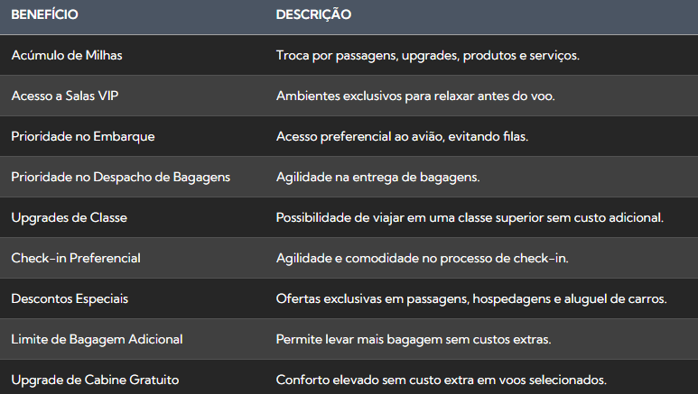 Participar de um programa de fidelidade para passageiros frequentes oferece uma gama ampla de benefícios. Esses programas são projetados para recompensar os viajantes, proporcionando-lhes vantagens exclusivas que melhoram tanto a conveniência quanto o conforto durante suas jornadas. Abaixo, segue uma tabela com os principais benefícios.